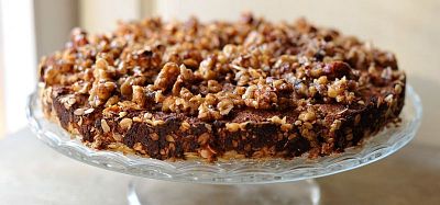 160g — Jablkovo-banánový koláčik s ovsenými vločkami a kokosom, posypaný karamelizovanými orieškami a osladený medom.1,3,8