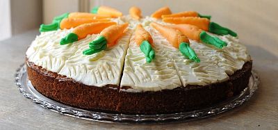 140g — Mrkvový korpus s kyselkavým citrónovým krémom s mascarpone a marcipánovými mrkvičkami.1,3,7,8