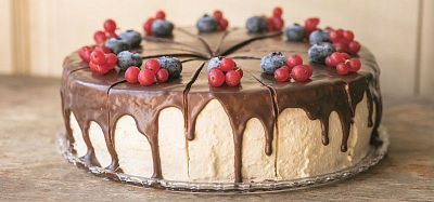 140g — Svieža tortička s vanilkovým korpusom naplnená krémom s ovocím, poliata čokoládou a ozdobená ovocím.1,3,7