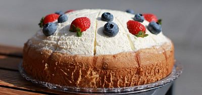 130g — Ľahká torta bez múky s čerstvým ovocím, vanilkovým krémom a nadýchanou šľahačkou s mascarpone.3,7