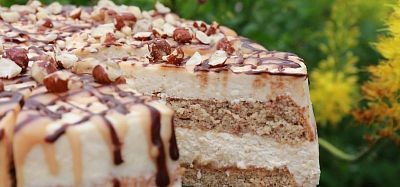 165g — Smotanovo-karamelový krém s mascarpone, orieškový biskvit, poliaty slaným karamelom a čokoládou a posiaty lieskovými orieškami.1,3,7,8